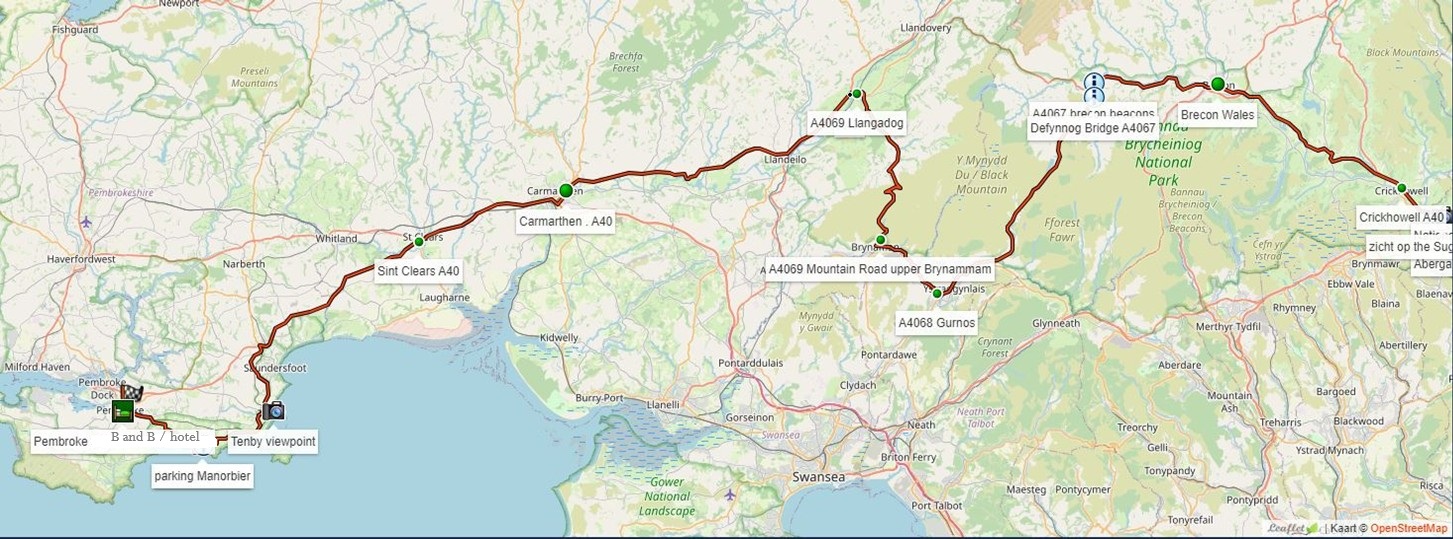 Dieser Name ist nicht unsonst. Eine wirklich schöne Route auf dem kahlen Hanmg des "Black Mountain". Hinweis: auf halbem Weg gibt es einige scharfe Kurven uber einen kleinen Pass. Wir gehen den Berg runter durch das Tal des Flusses Clydac. Es gibt hier zwischen den Weilern Pont Clydach und Afon Clydag einige schöne Wasserfälle Und Unerwartet eine steile Abfahrt. Konzentration ist wünschenswert, trotz der schönen Landschaft. Wir erreichen das Dorf Llanngadog auf der A40 in Richtung Westküste.