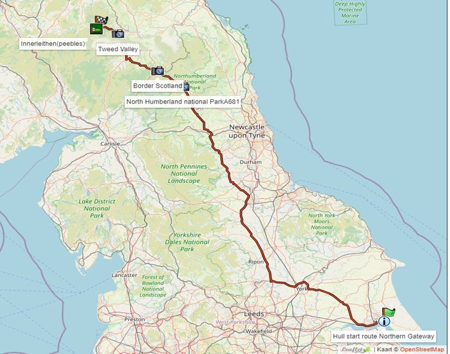 Na York zoeken we de A1 Motorway op om 70 km later ter hoogt van Darlington de A68 te nemen tot de Schotse grens. Ter hoogte van Newcastle (dat we rechts laten liggen) komen we door het Northumberland National Park.