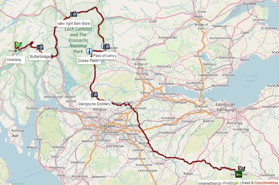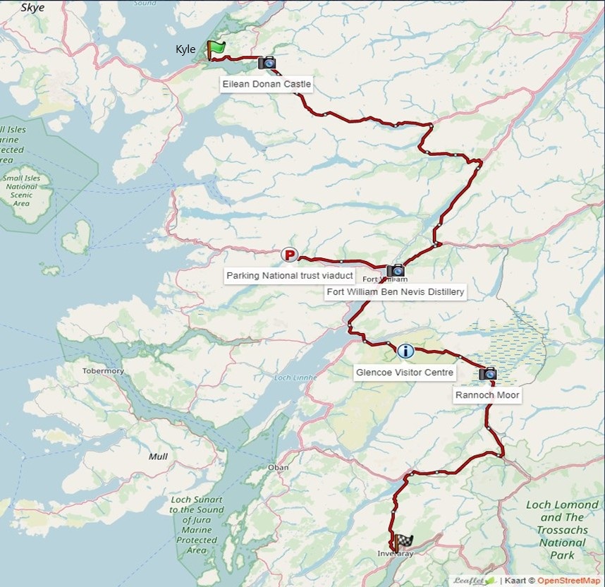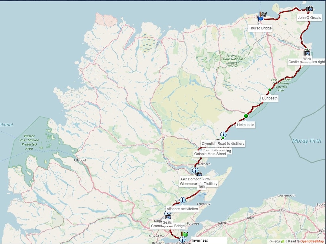 Daarom leiden we de GPS-route niet altijd direct door of langs de toeristische attracties, maar geven met een waypoint de afslag aan. Wil je bijvoorbeeld een pittoresk (vissers) dorpje, kasteel of whisky-stokerij bekijken dan neem je de afslag en keert daarna terug op de route.