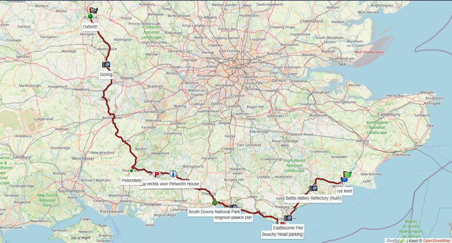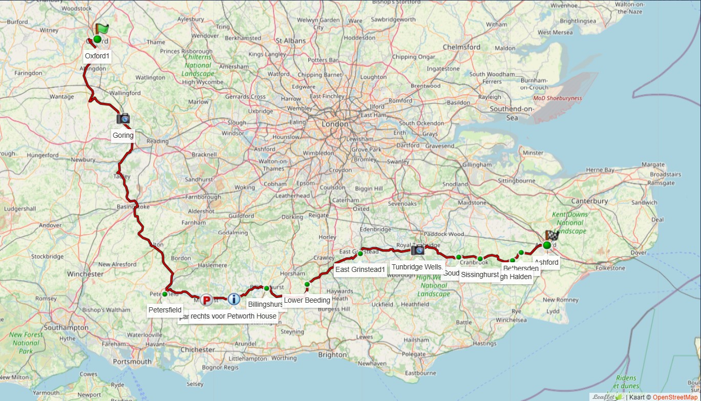 We maken de afstand tot London zo groot mogelijk en rijden zo door het hart van Kent en East and West Sussex. Met leuke plaatsen als Uckfield, Haywards Head, Billinghurst.